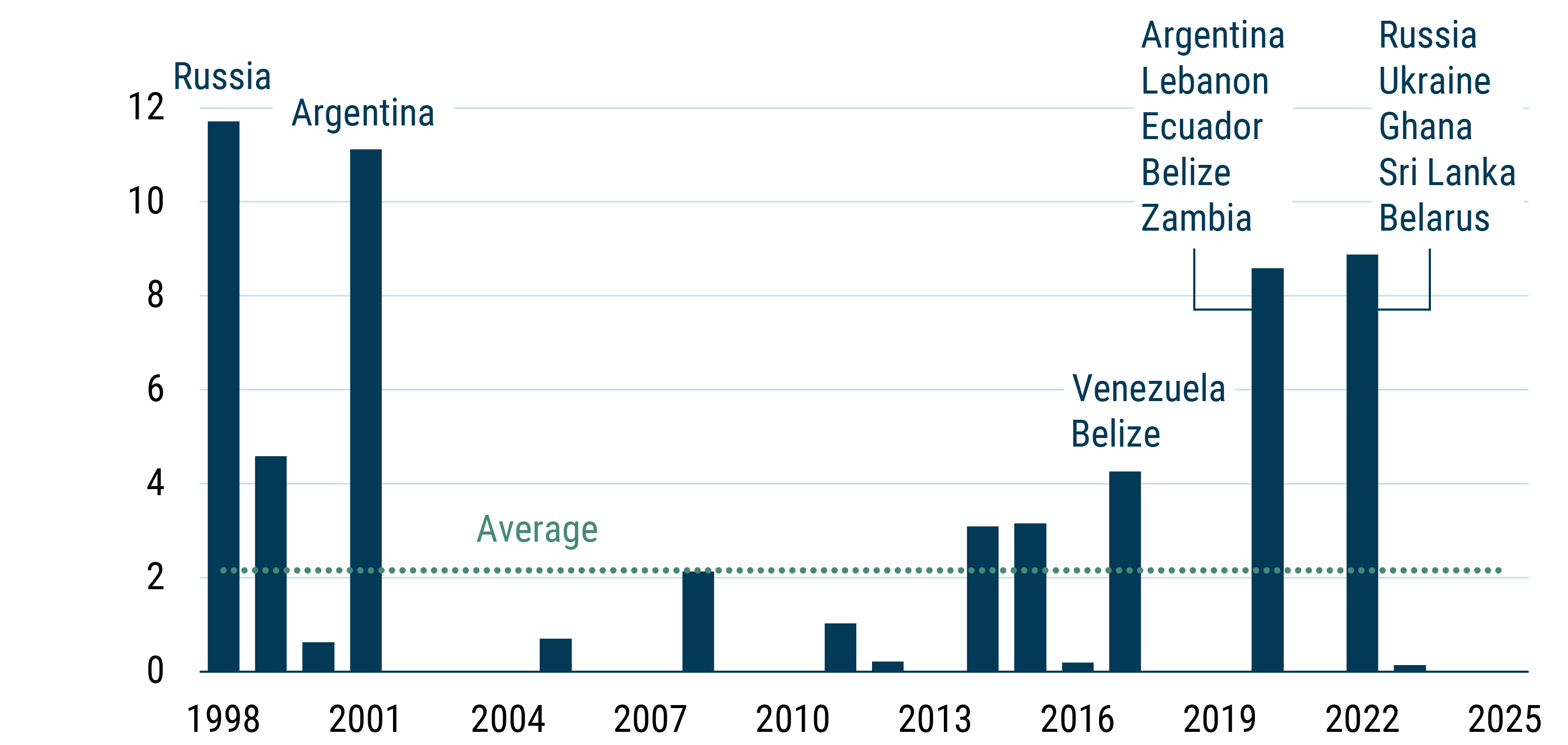 We believe that we are on the “other side” of the default cycle in this market and will likely return to the historical norm of about one sovereign default per year—out of 69 countries currently in the benchmark. Indeed, we have not had a sovereign default in 2024 or 2025.