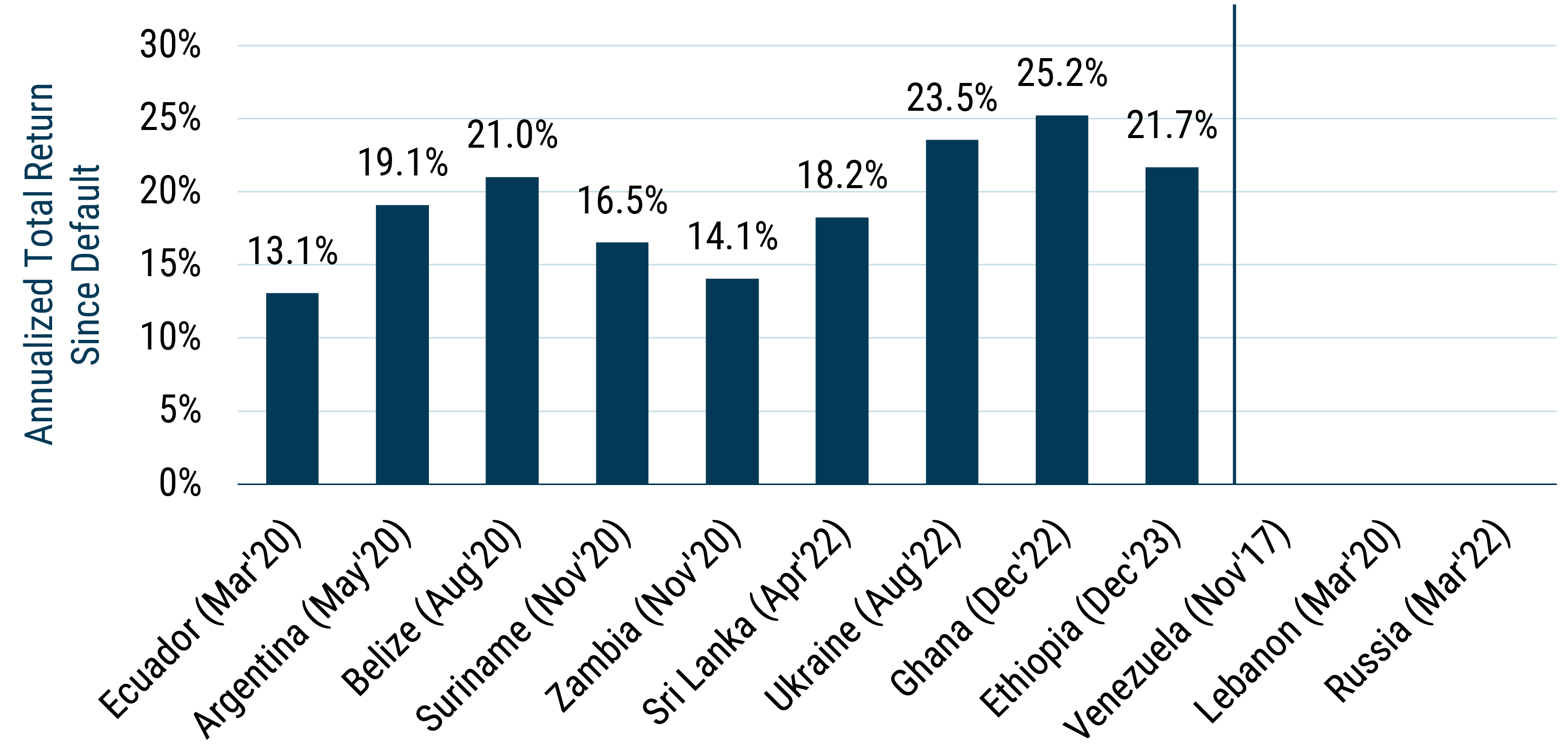 Pre-2024, non-sanction-related defaults, including Ecuador, Argentina, Suriname, Zambia, Ghana, and Sri Lanka, had been restructured on reasonable terms for bondholders. Ultimate recoveries in all these cases have been above (sometimes well above) 50 cents of par, which is consistent with the historical experience. Ukraine remains a special case, and conditions may be forming for Lebanon to finally begin its recovery out of financial distress.