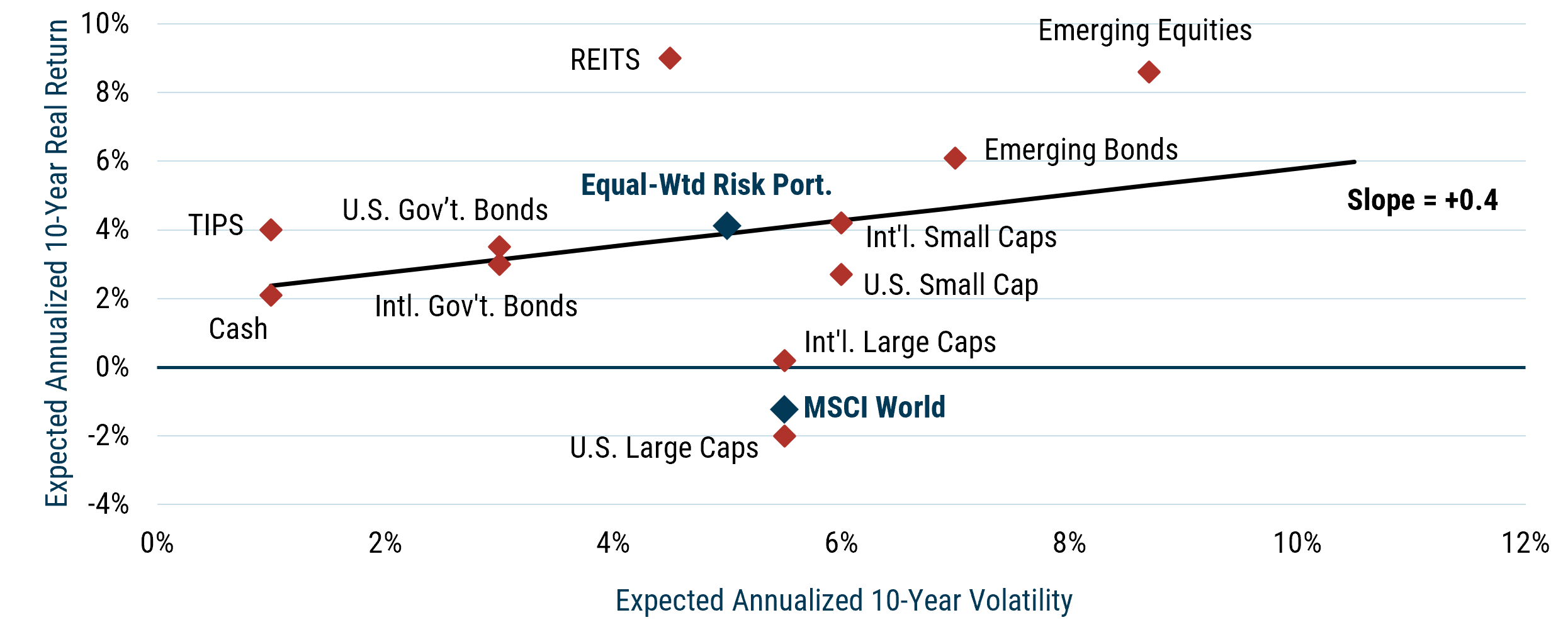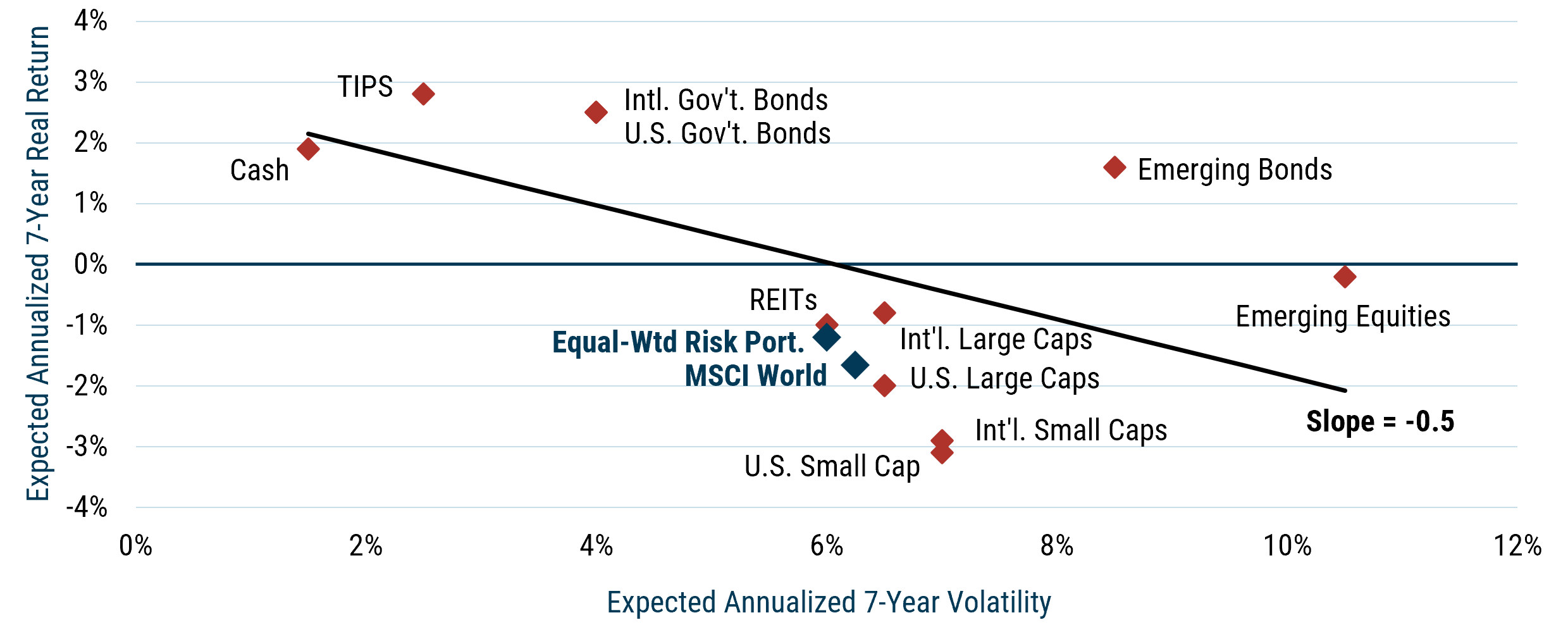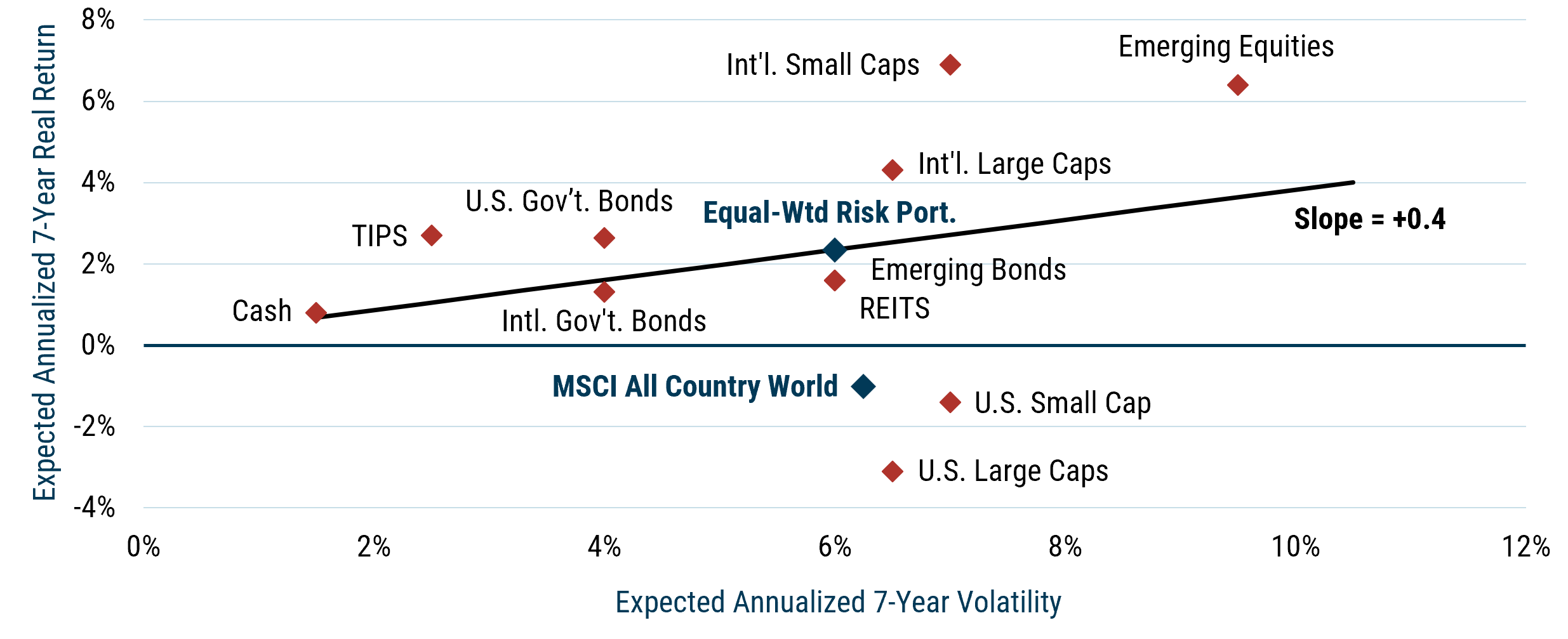 With U.S. large cap stocks trading at their highest valuations ever, their expected return was significantly negative in real terms. But for an investor prepared to look elsewhere, there was plenty to do. Several other risk assets were trading cheaply relative to history and offered better-than-normal expected returns. Despite the bubble, investors were actually getting paid nicely for taking risk overall. Drawing a risk/reward regression line through the forecasts illustrates this: the line’s slope of +0.4 is not far off an equilibrium slope of +0.6. The benefit to diversifying beyond a cap-weighted portfolio was huge; an equal-weighted portfolio of the risk assets we forecasted had an expected return of +4.1% real, far higher than the MSCI World’s -1.2%.