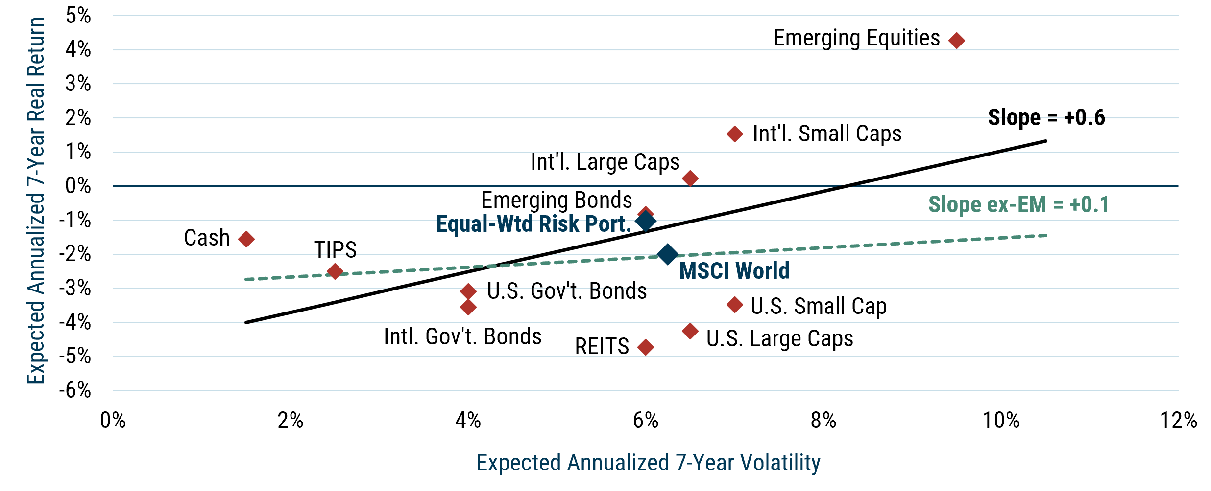 But markets were not entirely back to normal in 2005. In fact, a global housing bubble was already nearing its peak, and the loose monetary policy that enabled speculation in real estate had encouraged investors to bid up risk assets of all kinds. By 2007, this had turned into what Jeremy Grantham dubbed the “Everything Bubble,” where risk assets of all kinds had become overpriced simultaneously. 12 This provided a very different challenge for investors, as shown in Exhibit 2, a risk/reward scatterplot of our asset class forecasts as of June 2007.