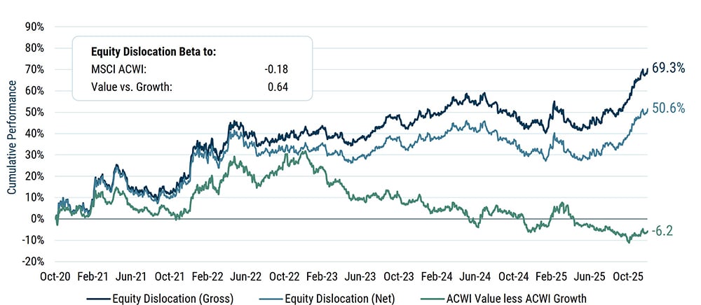 We believe that this profile can be maintained, with the strategy managing remarkably well through periods of growth outperformance, while still delivering the excellent returns that we would expect in periods of value dominance. (For example, the last two months of 2025 saw value rotate back into the ascendancy—MSCI ACWI Value beat MSCI ACWI Growth by 5.0%, with the Equity Dislocation Strategy up 8.7% gross of fees and 8.3% net for the same period).