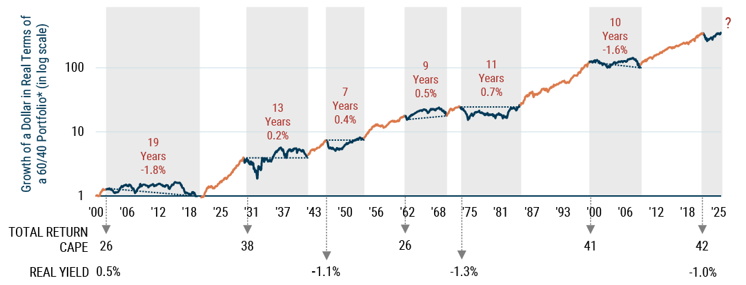 As of 9/30/2025 | Sources: Bloomberg, Global Financial Data (early history), Factset (S&P500 returns and CPI), J.P. Morgan (J.P. Morgan GBI United States Traded), Shiller data, Federal Reserve Bank of Philadelphia (U.S. Treasury Yields and Long-term Inflation Expectations). Real yield is the yield on the 10-Year U.S. Treasury minus Philly Fed Long-Term Inflation Expectations (1992-present) or the 12-month trailing CPI (early history). Current CAPE = 42 and Real Yield = 1.8%.