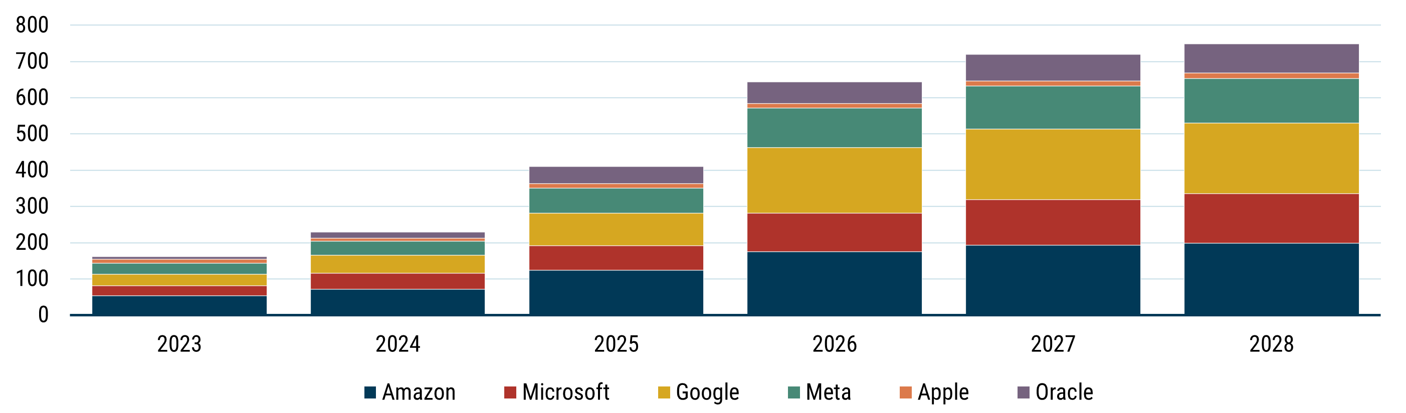 While the historical evidence of the impact of the investment boom is strong, observers have put forward several arguments for why this time might be different. Some analysts have argued that the boom in AI spending isn’t about growth but more of a necessity. Due to fundamental technological changes, businesses such as Hyperscalers need to invest to remain relevant. This boom isn’t a medium-term cyclical investment, so much as a structural change. If firms don’t invest, they will become irrelevant. Others have pointed out that because the Hyperscalers are cash-rich with high margins, this investment is less likely to drain returns.