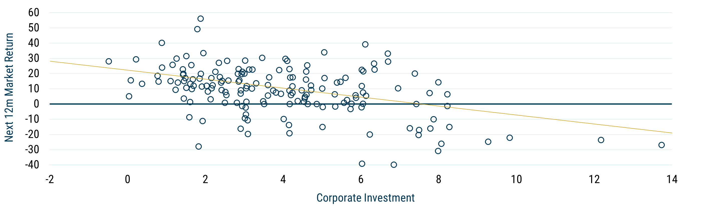 • Counterintuitively, historical booms in corporate investment have been associated with recessions and lower equity returns.