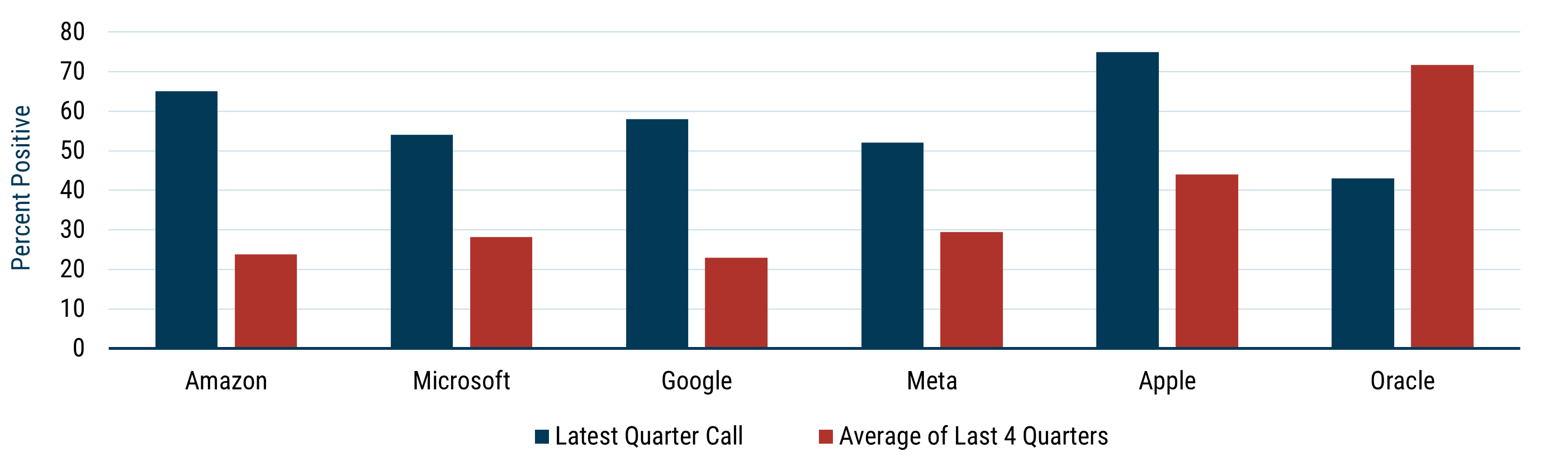 The paper from Jiang et al. (2019) also highlights an interesting observation. While we don’t wish to drill down into the analysis of earnings call sentiment and its impact on broader markets (that is a deeper issue worthy of a separate paper), we note that the most recent earnings calls from the main Hyperscalers have been extremely positive. For all the Hyperscalers (except Oracle), the most recent calls have been significantly more positive than their average over the previous 4 quarters.