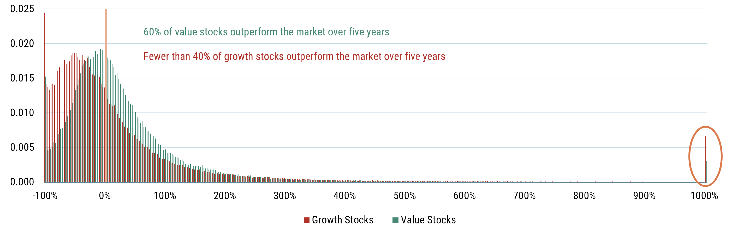 Growth stocks (Exhibit 1, red bars) offer a very different return distribution, with perhaps the most noticeable difference being that over twice as many growth stocks go on to become 10-baggers. But chasing these success stories has an unpleasant downside–one that is often ignored as inconvenient stocks simply vanish from growth portfolios and are never mentioned again. The proportion of growth stocks that go bankrupt is over 50% higher than that of value stocks (Exhibit 1, far-left red bar), while fewer than 40% of growth stocks have outperformed the market over five-year time frames.